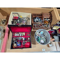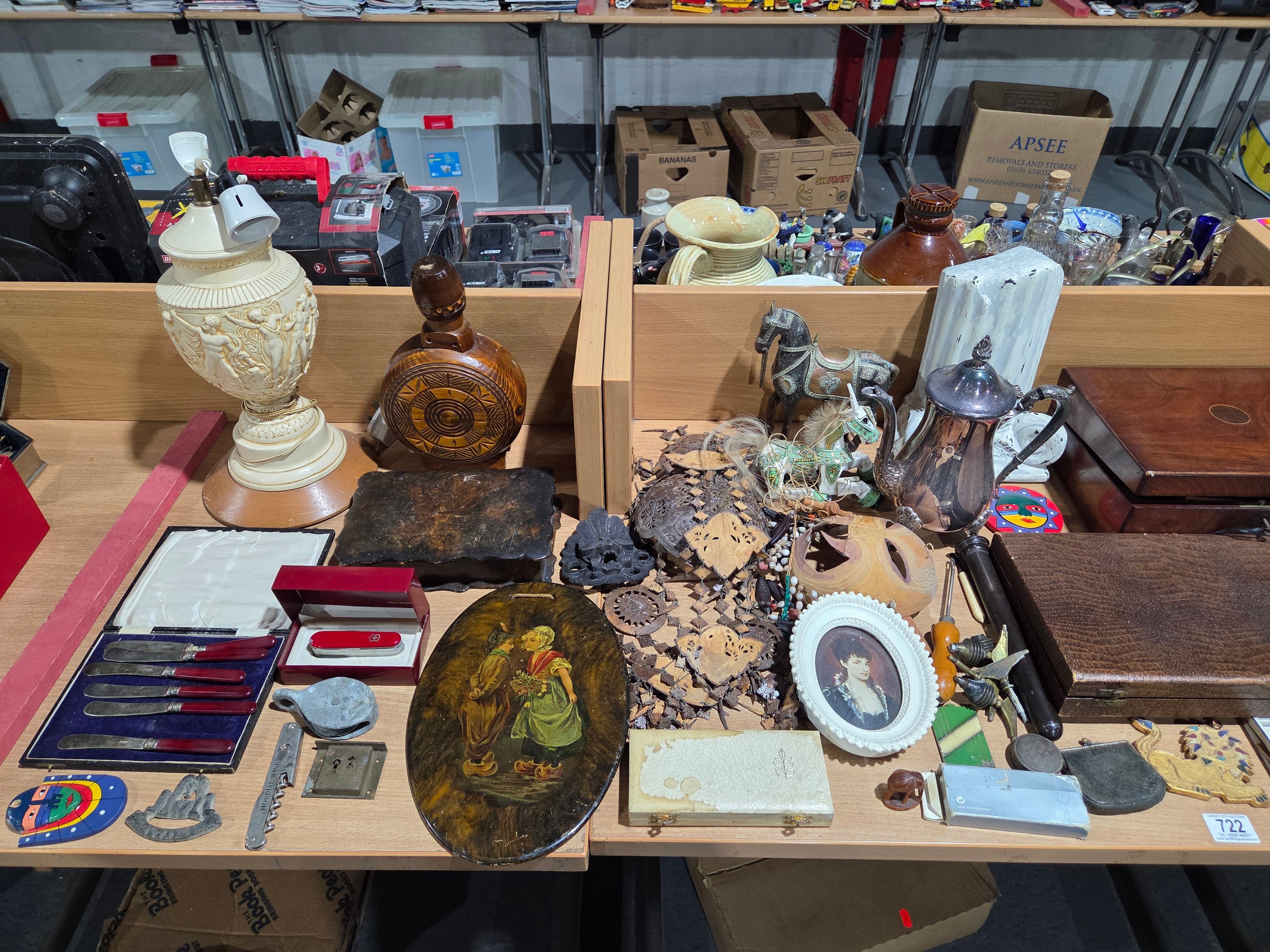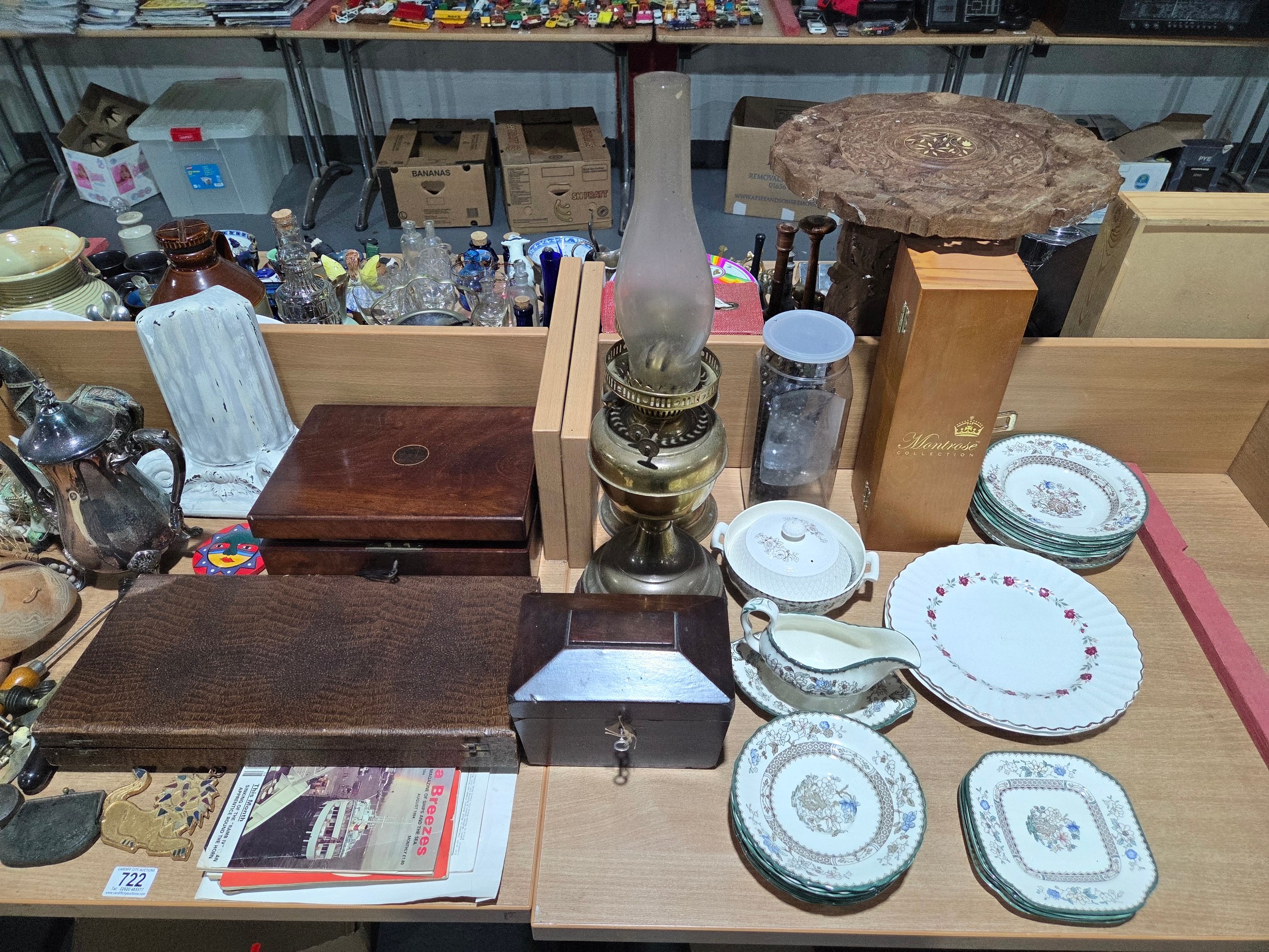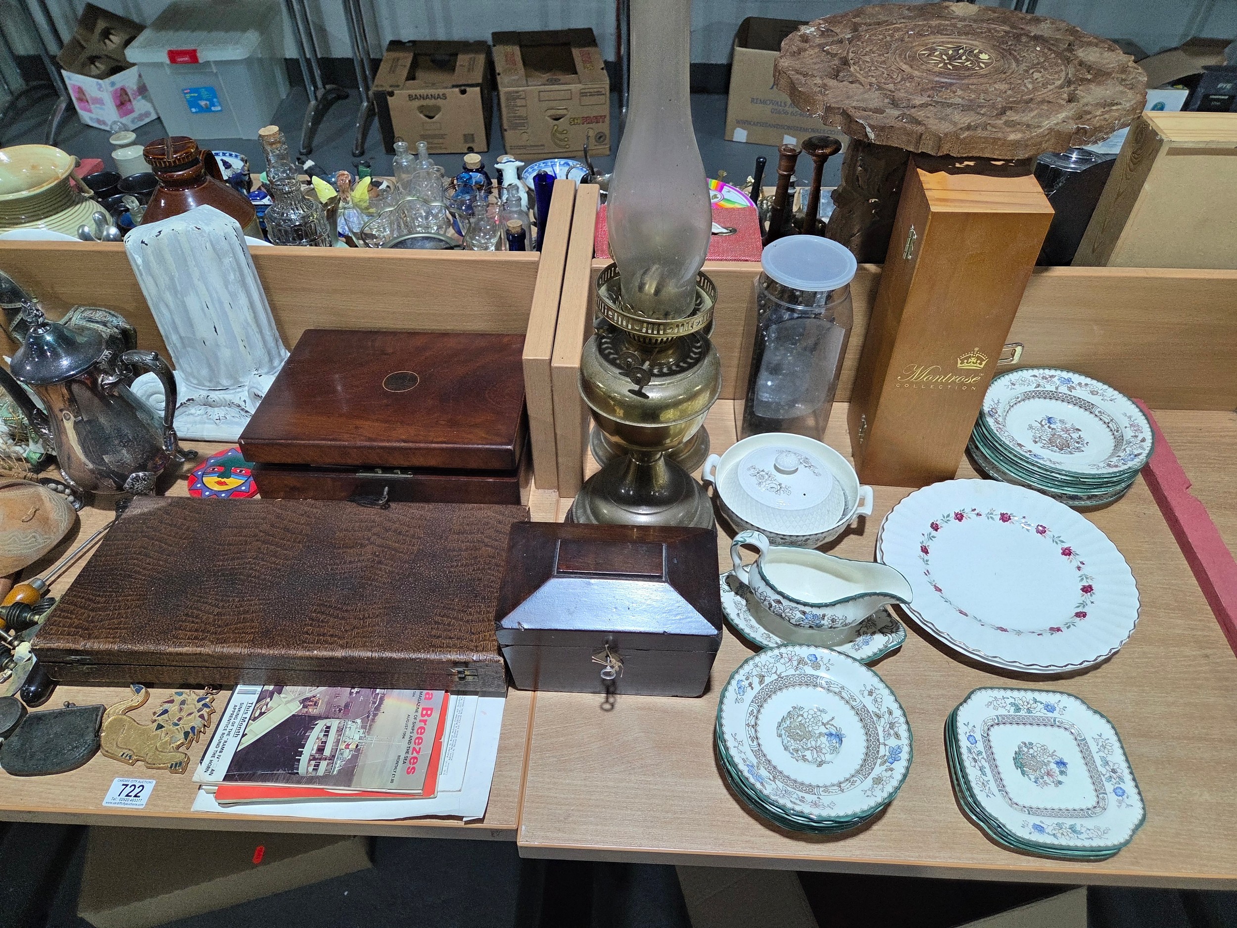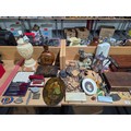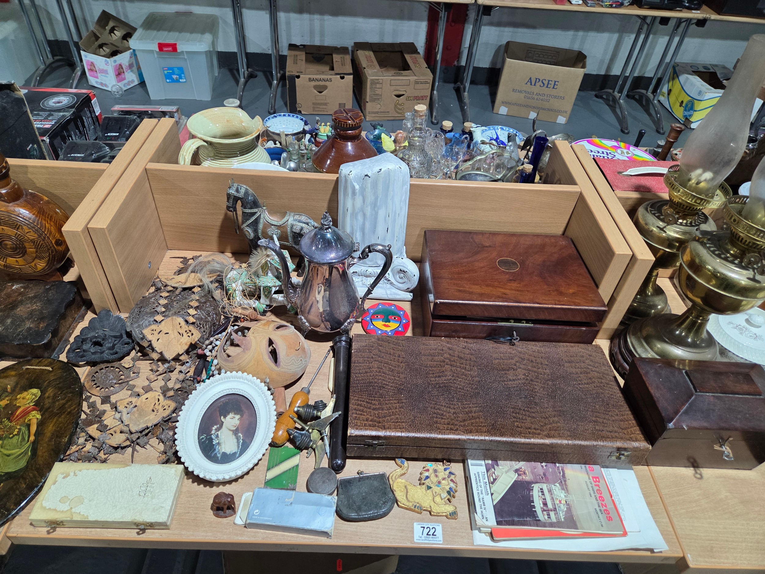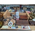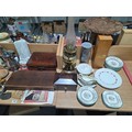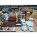 Two brass oil lamps, writing slope, tea caddy, ornaments, lamps, etc