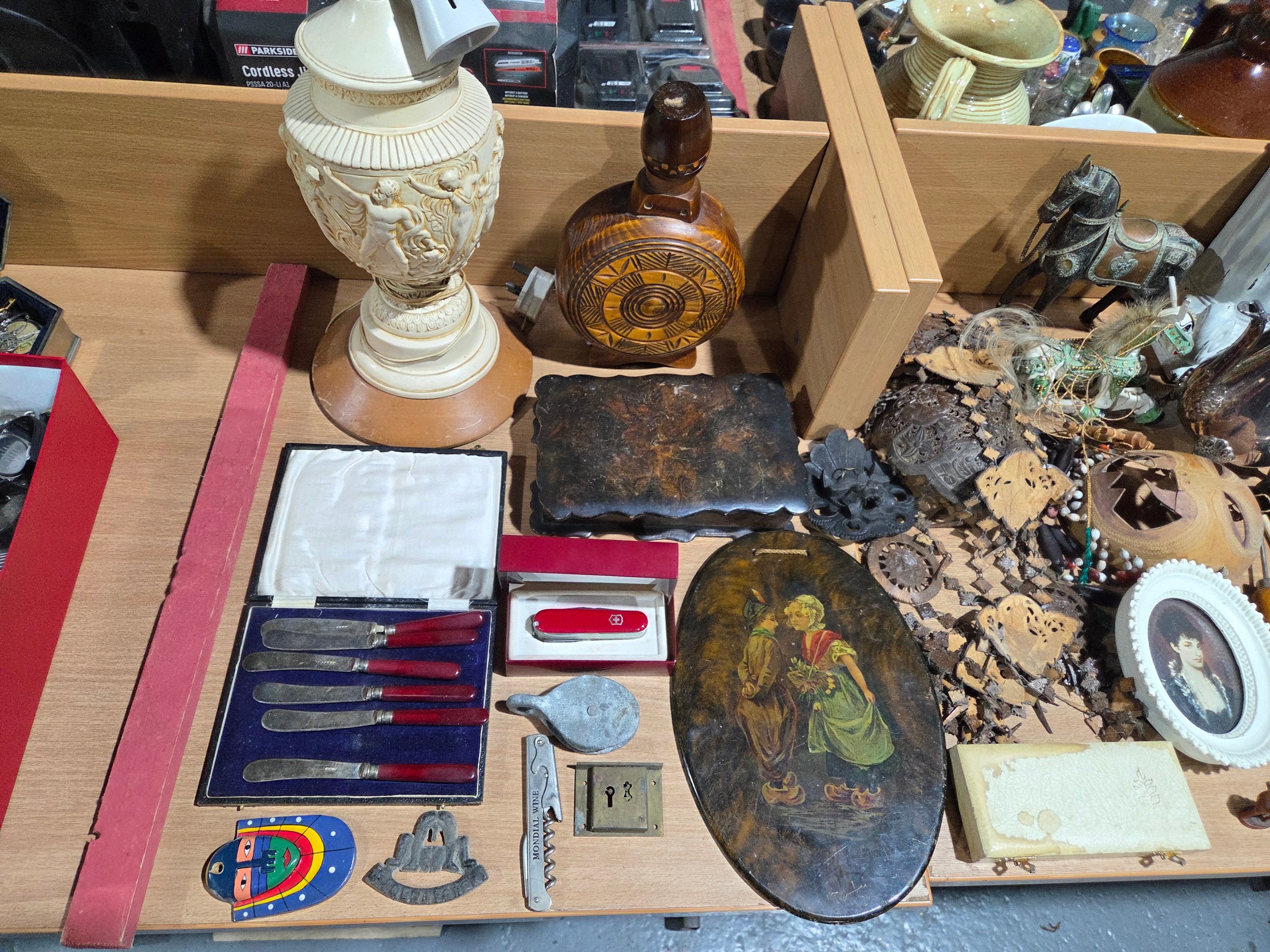 Two brass oil lamps, writing slope, tea caddy, ornaments, la...