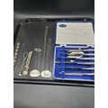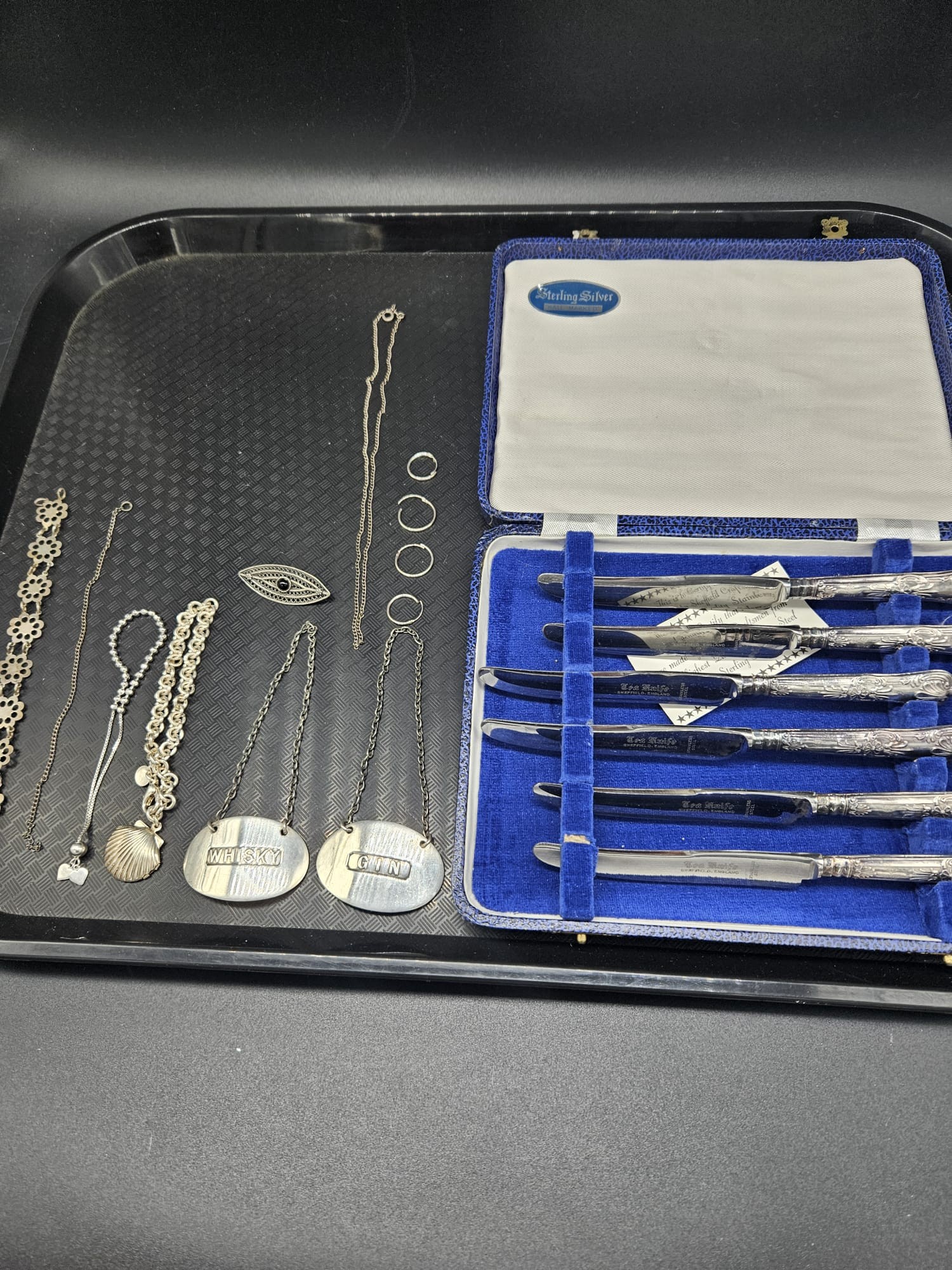 Silver handled fruit knives in original box together with silver decanter labels, chains etc.