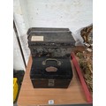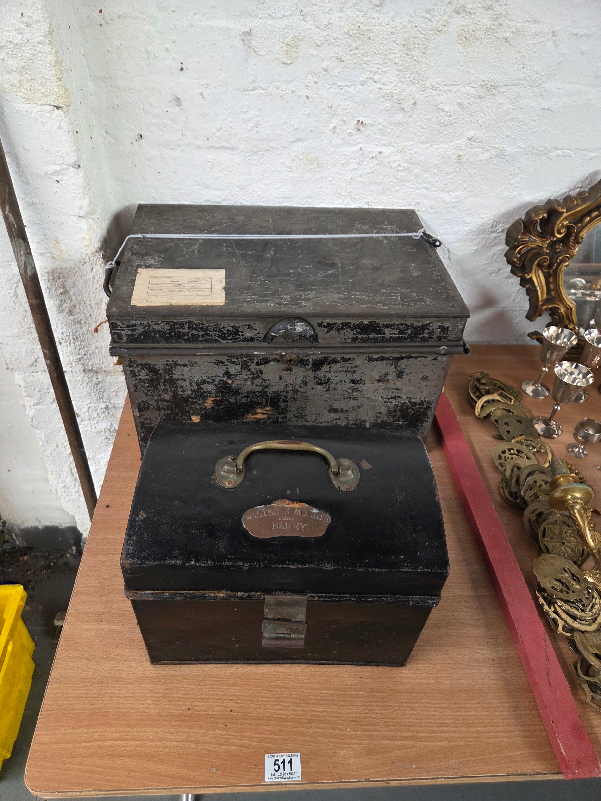 One vintage tin deed box with original key and a tin train drivers lunch box with brass plate "Walter E Morris - Barry - Driver".