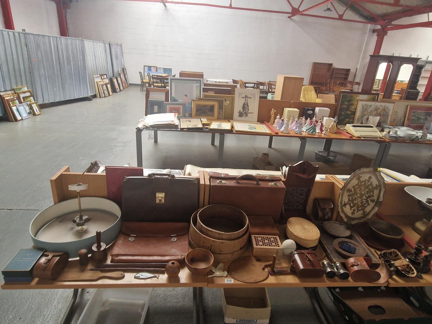 Vintage items to include leather briefcases, binoculars, vintage ceiling lightshade, wooden boxes etc.