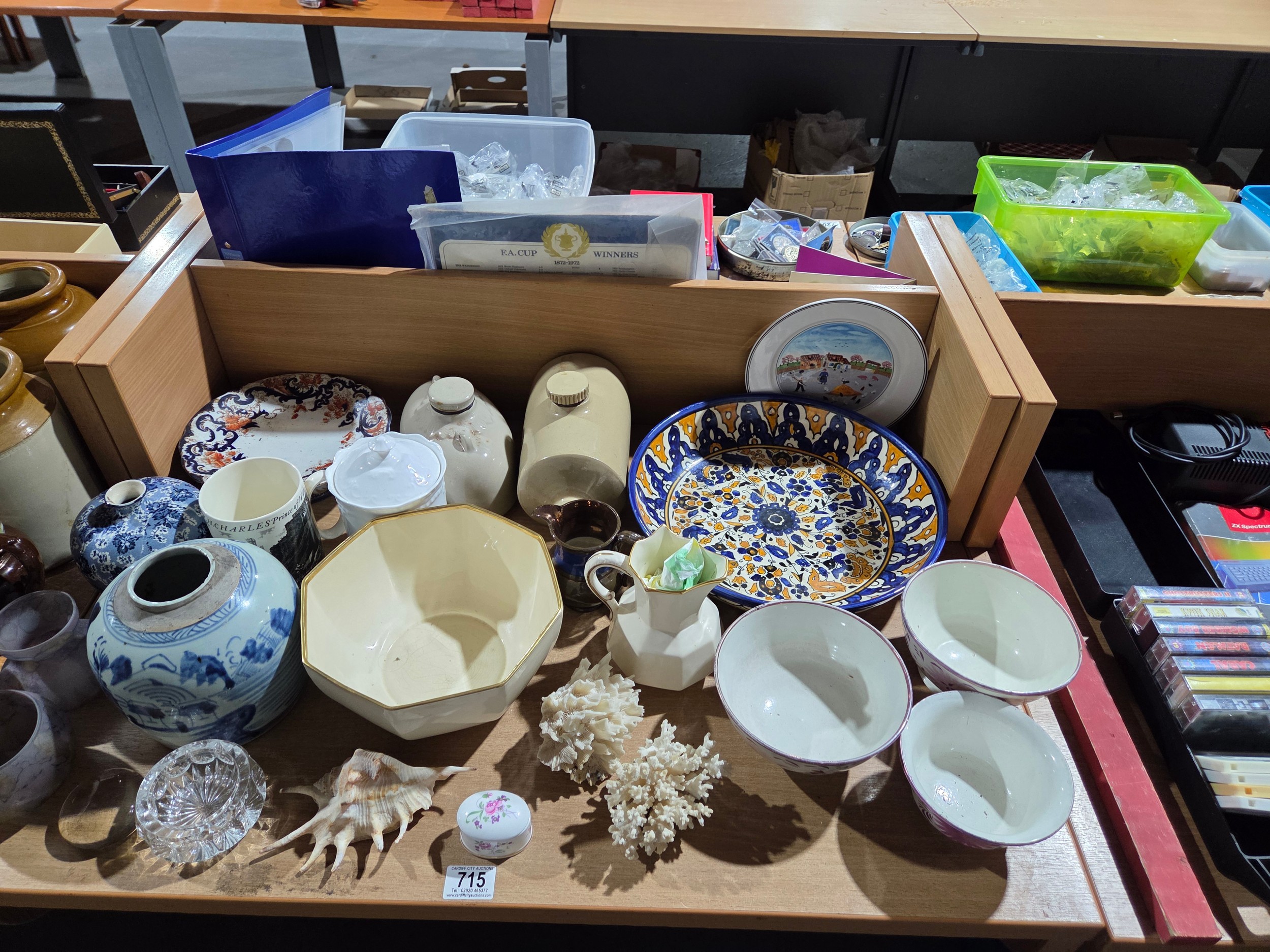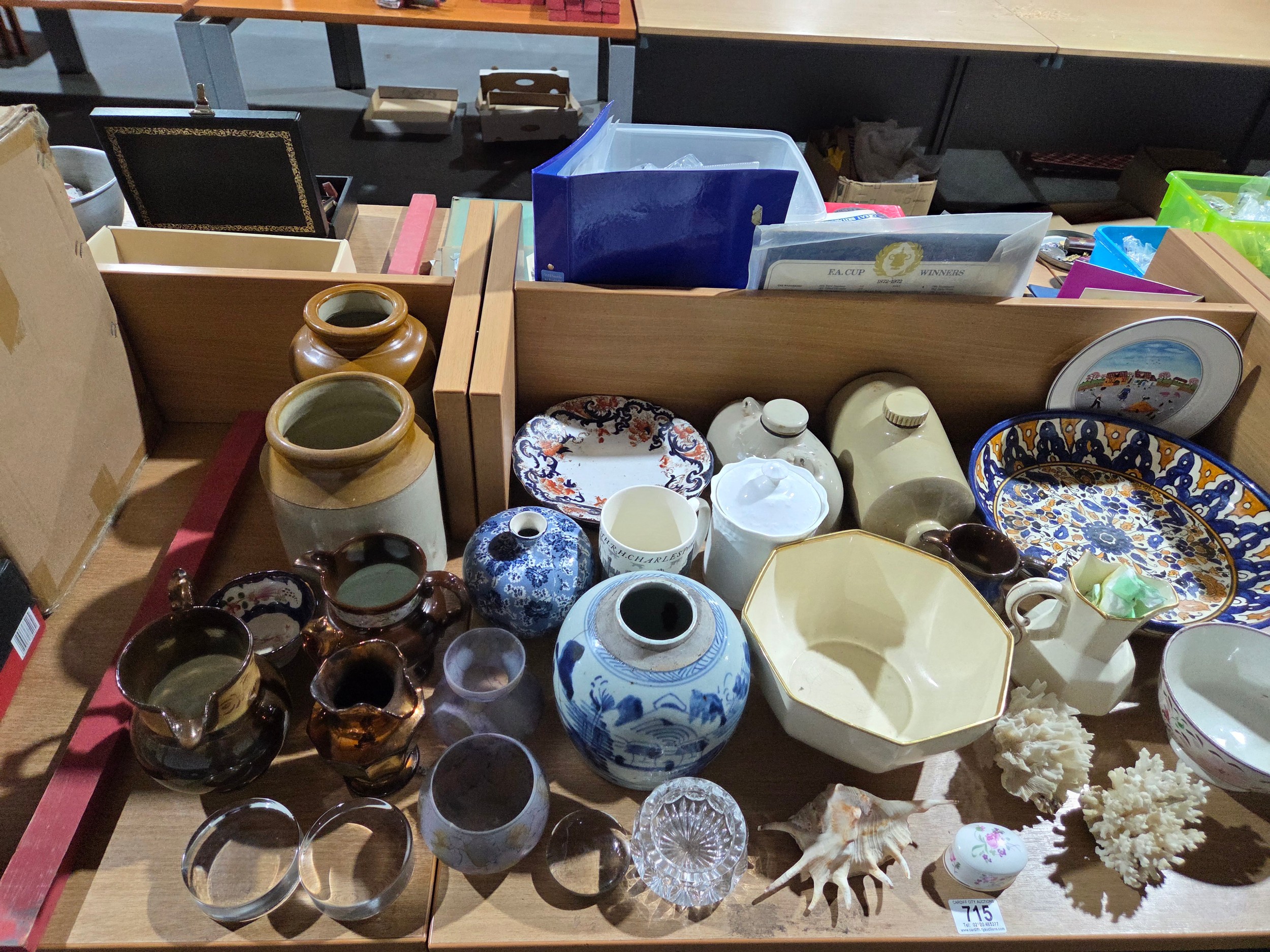 Decorative china stoneware pots, lustre jugs, shells etc