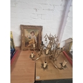 A brass four branch chandelier with a gilt frame tapestry of a boy and a rabbit
