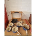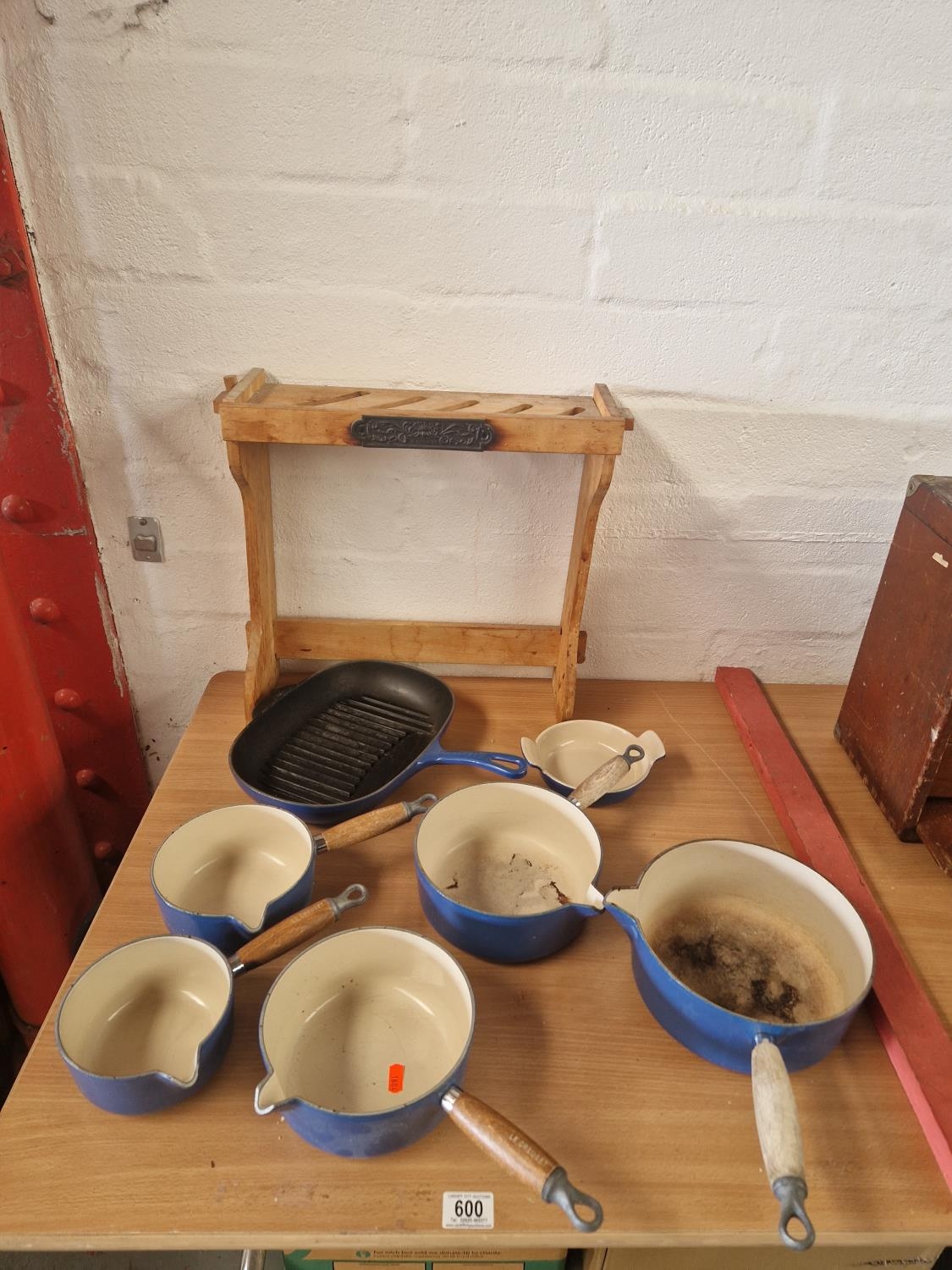Five enamelled Le Crueset pans with stand together with a frying/griddle skillet pan and butter dish
