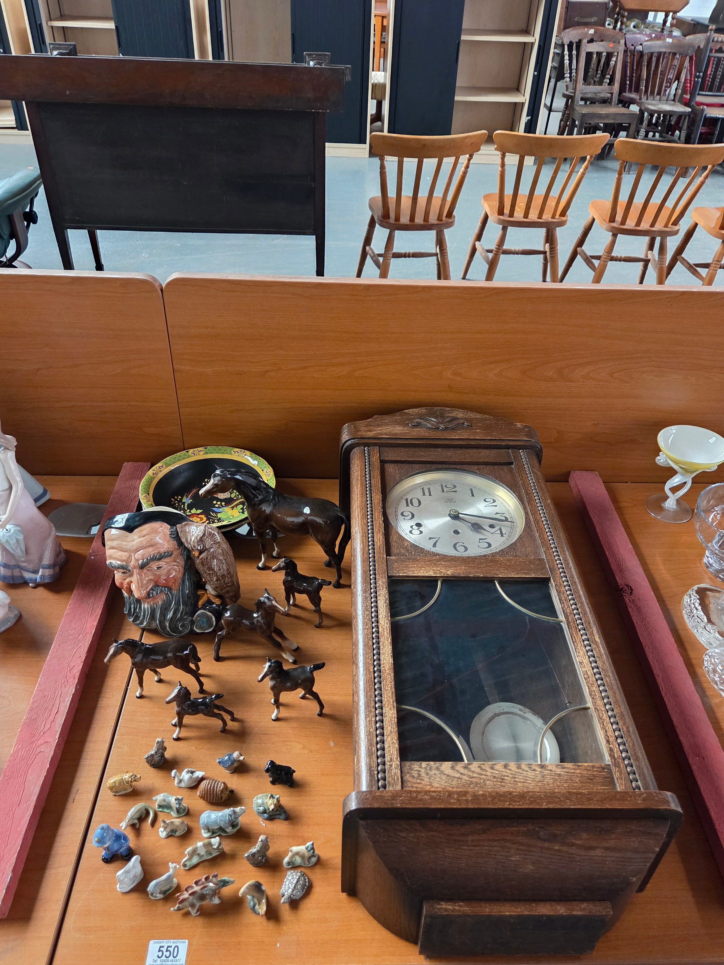 Six Beswick horses, Whimsies, Royal Doulton Merlin toby jug with a wall hanging clock