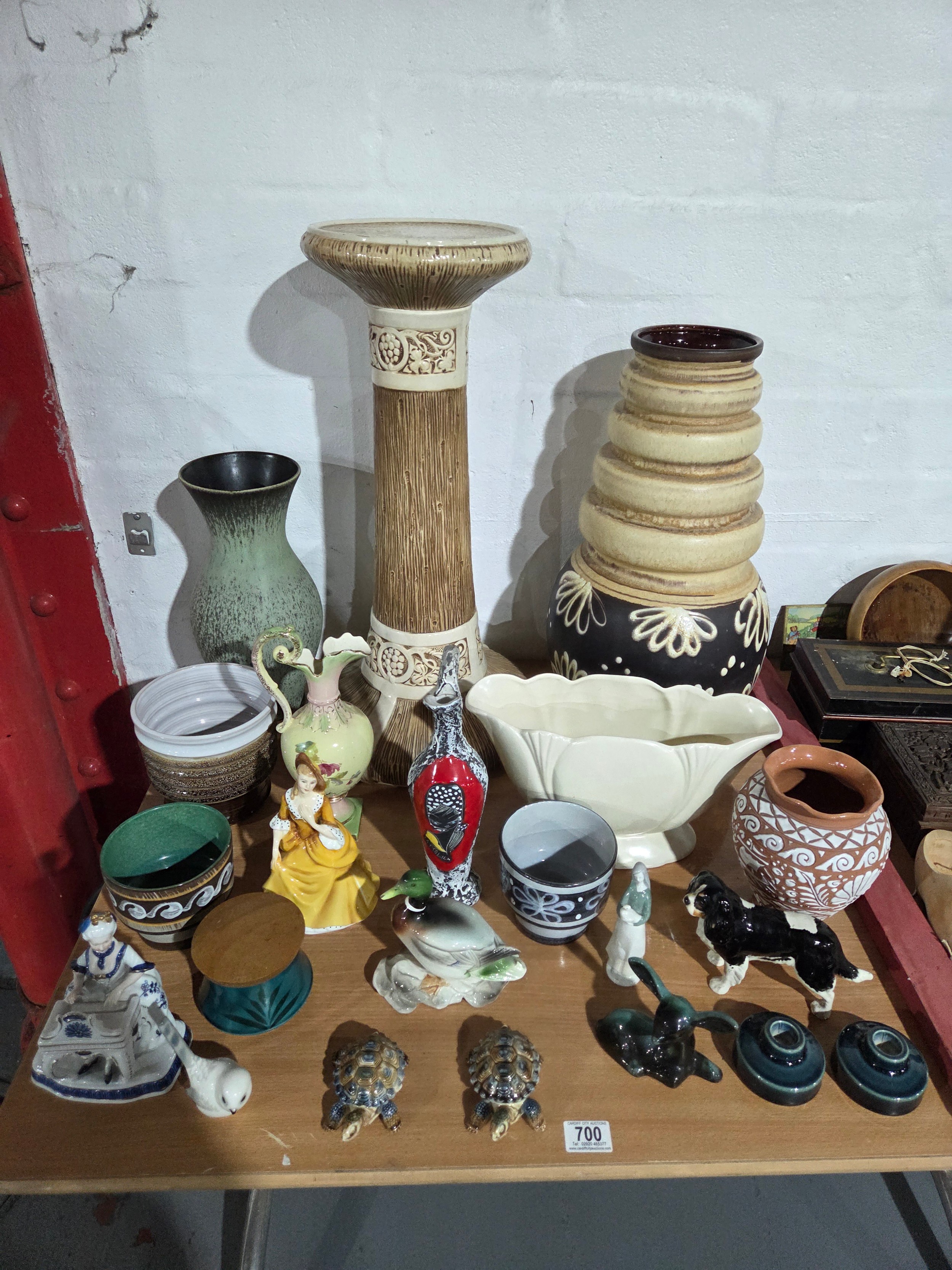 A Bretby jardinière stand, West German vase, Beswick dog, Royal Doulton figurine and other decorative china