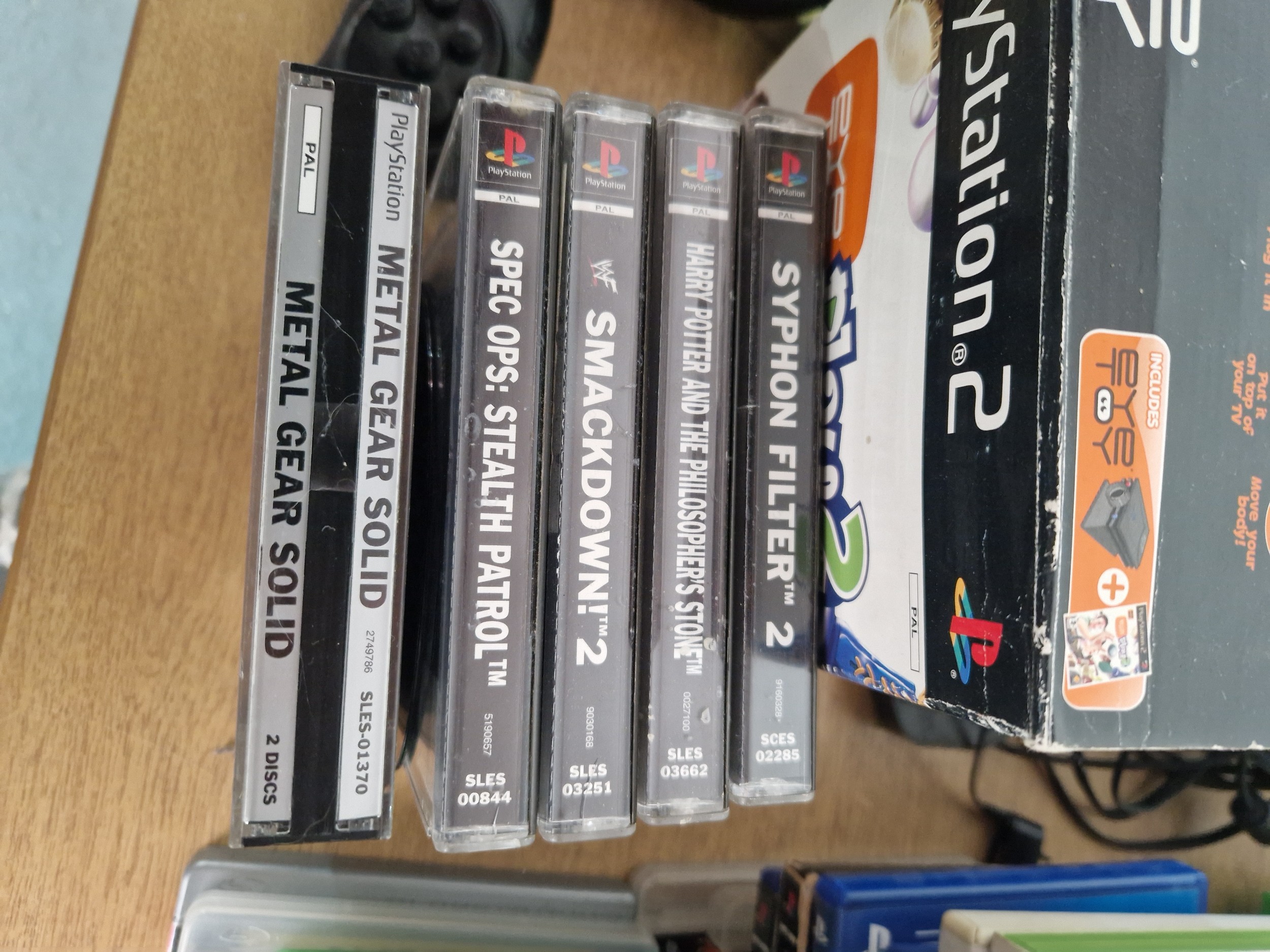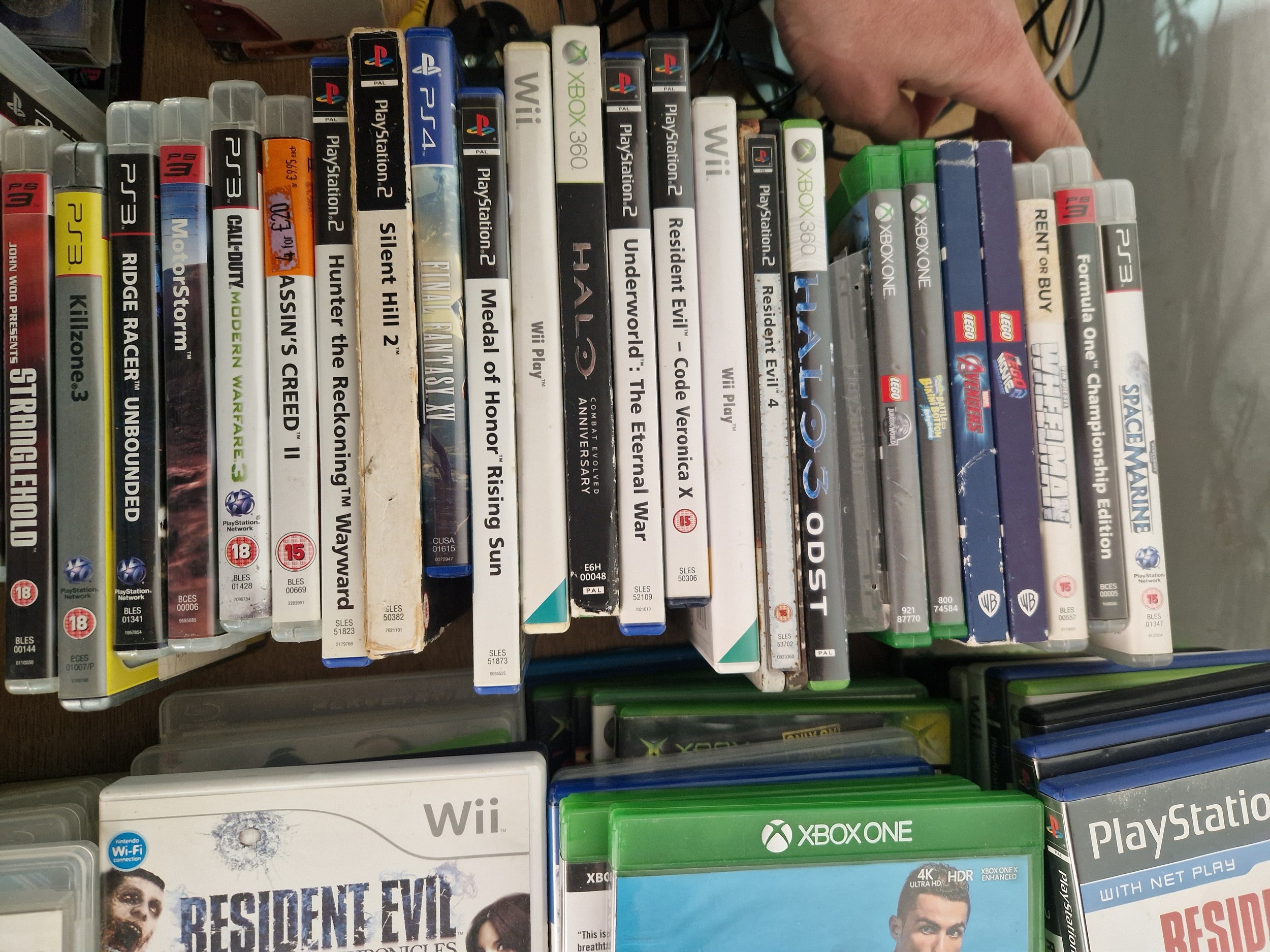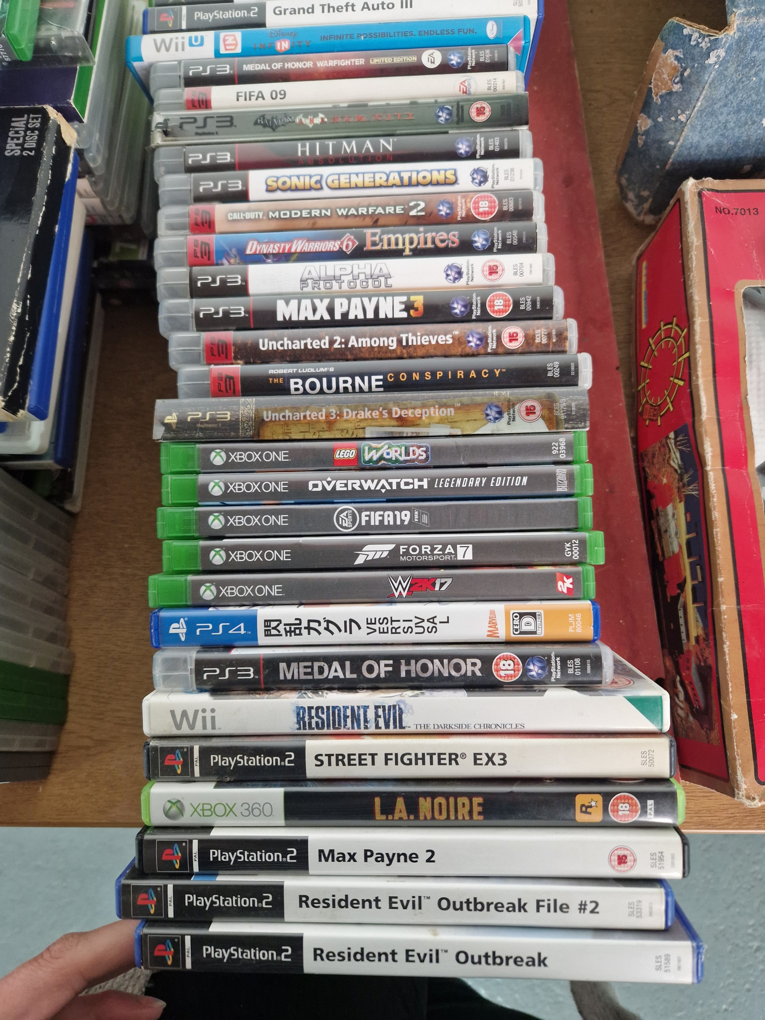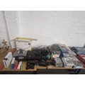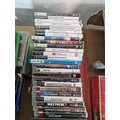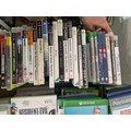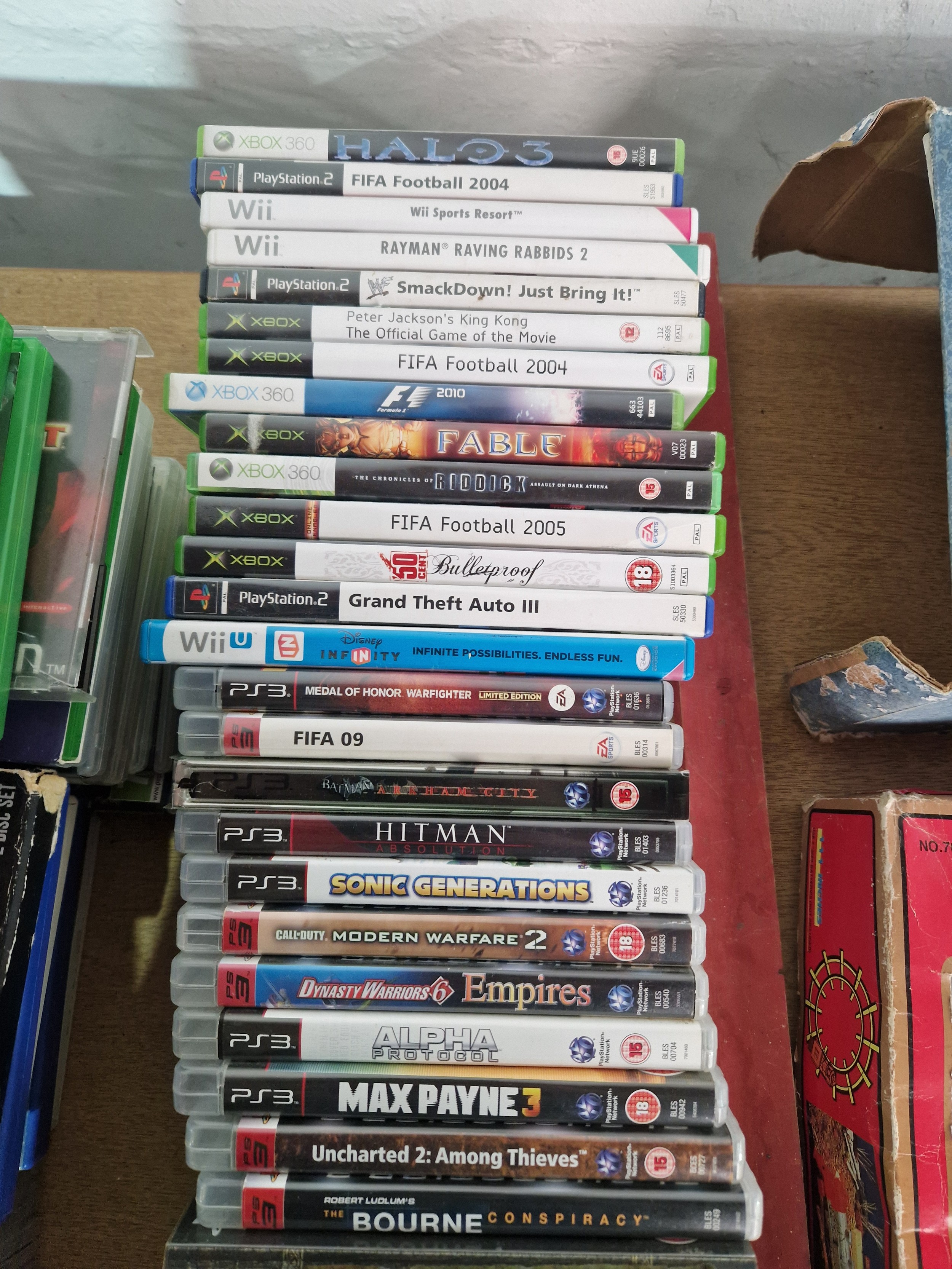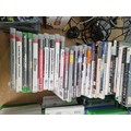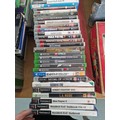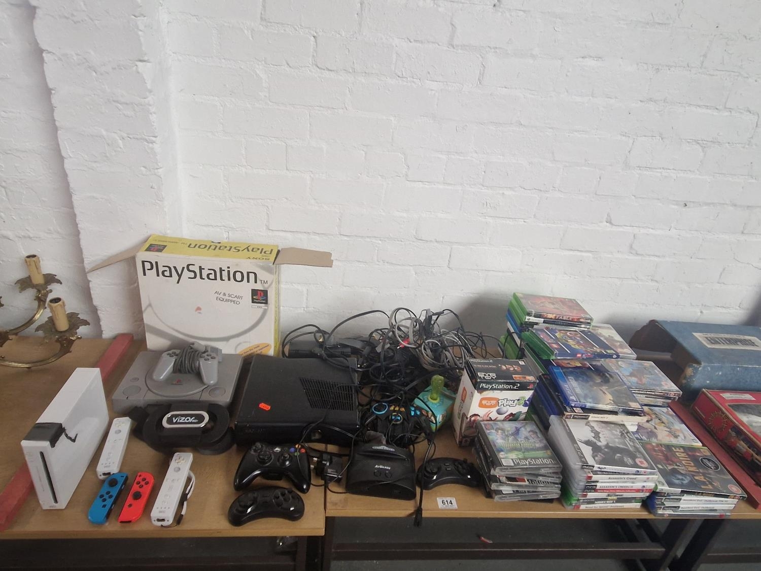 A boxed Playstation 1 console with controllers, Nintendo Wii console, Xbox 360 console with controllers and an assortment of Playstation and Xbox games