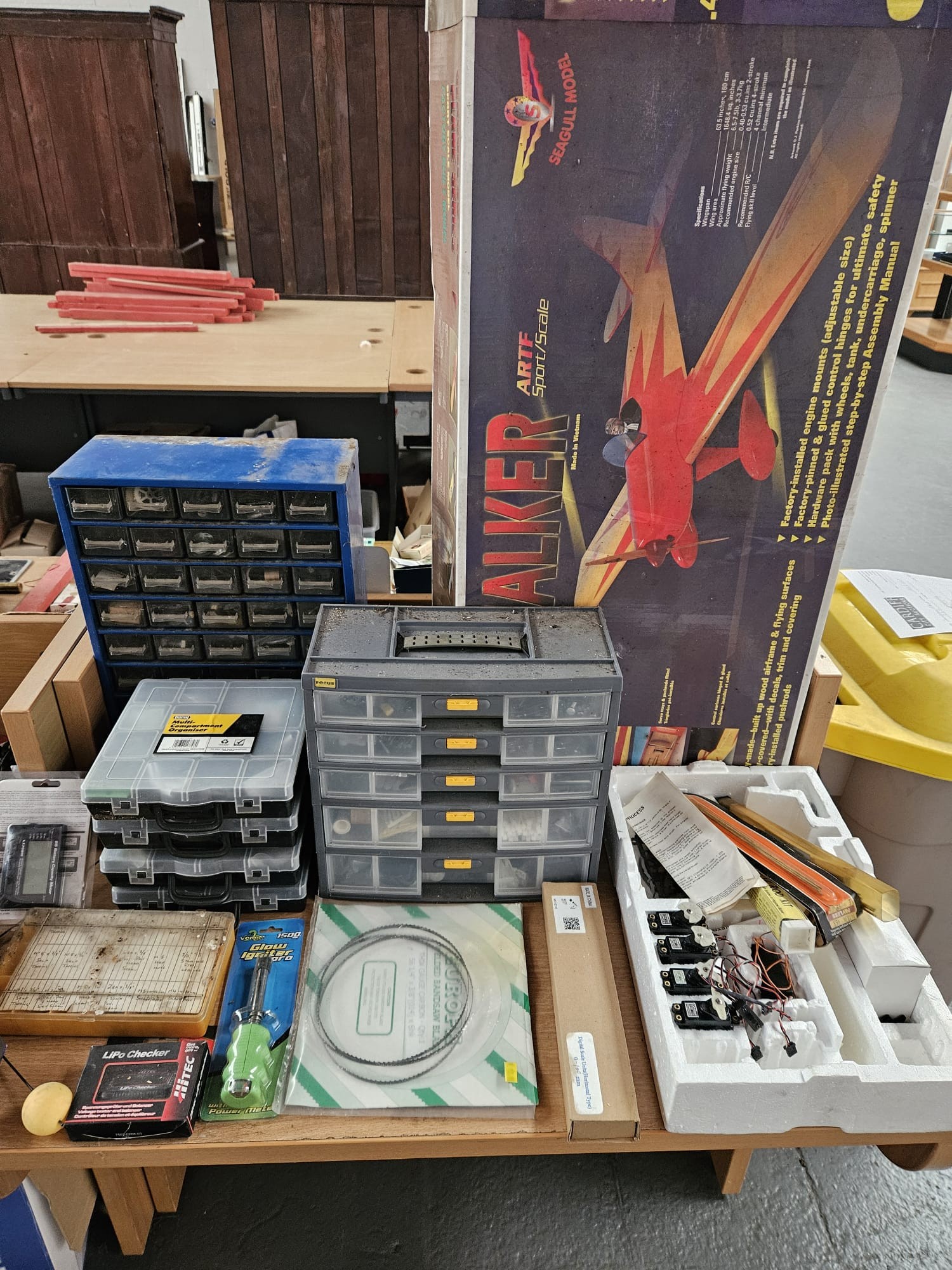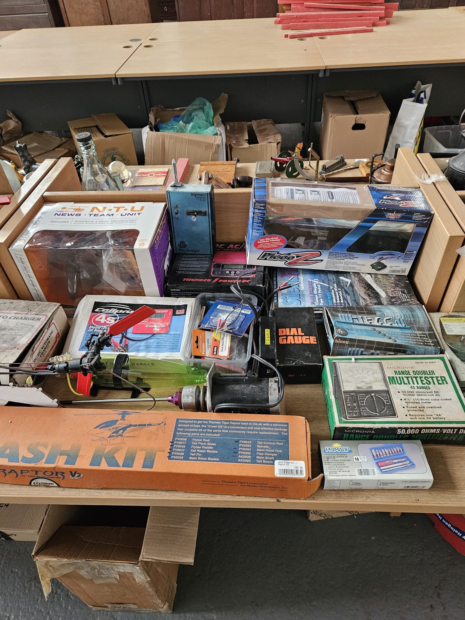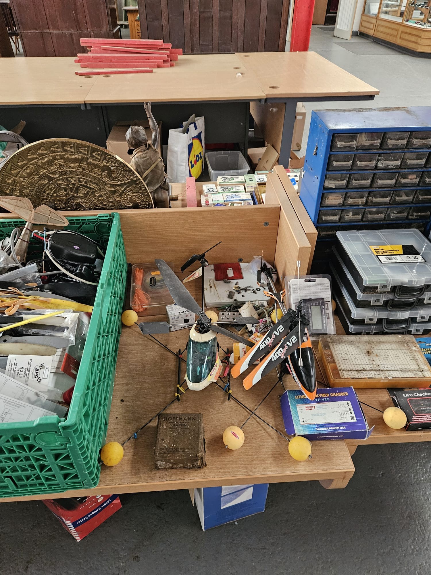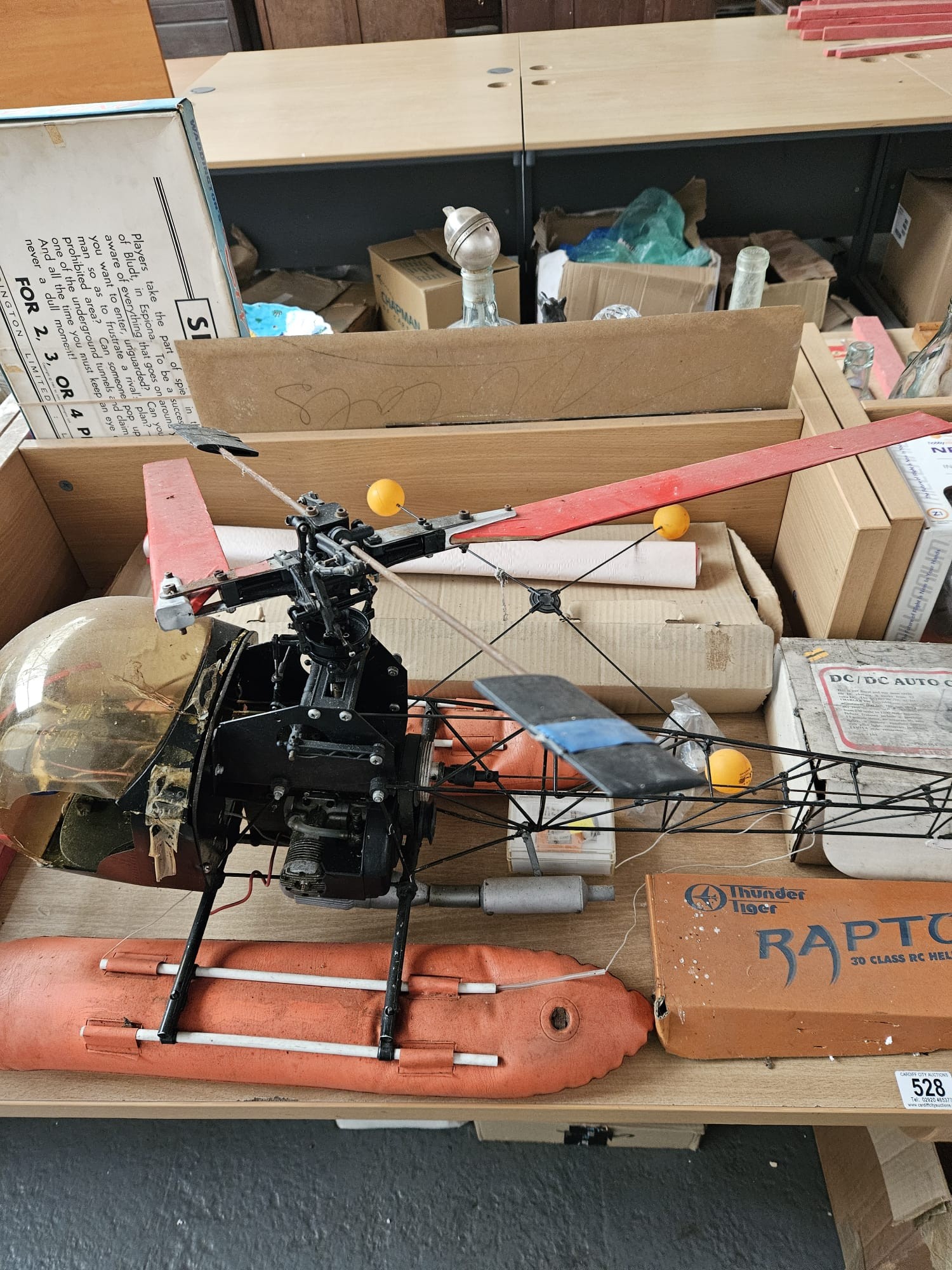 A boxed Spacewalker model plane, petrol powered helicopter (untested) together with other remote control helicopters and accessories
