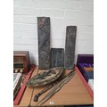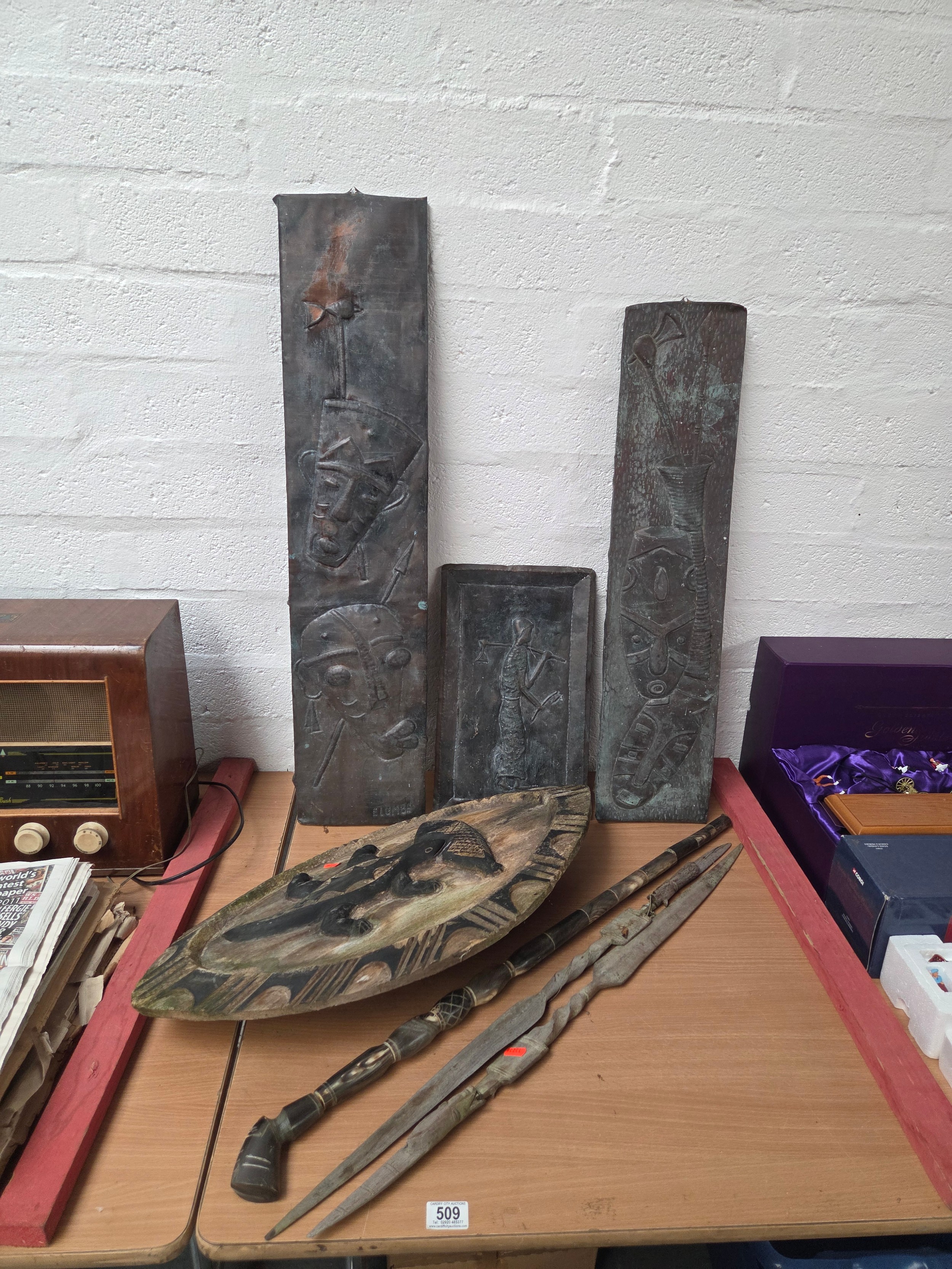 Three African beaten copper wall plaques, a horn walking stick and an ornamental shield and spears